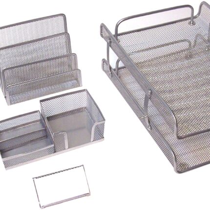 5 Piece Silver Mesh Desk Set Business card holder, Letter tray Memo holder, Letter holder Pencil cup, Paper clip cup